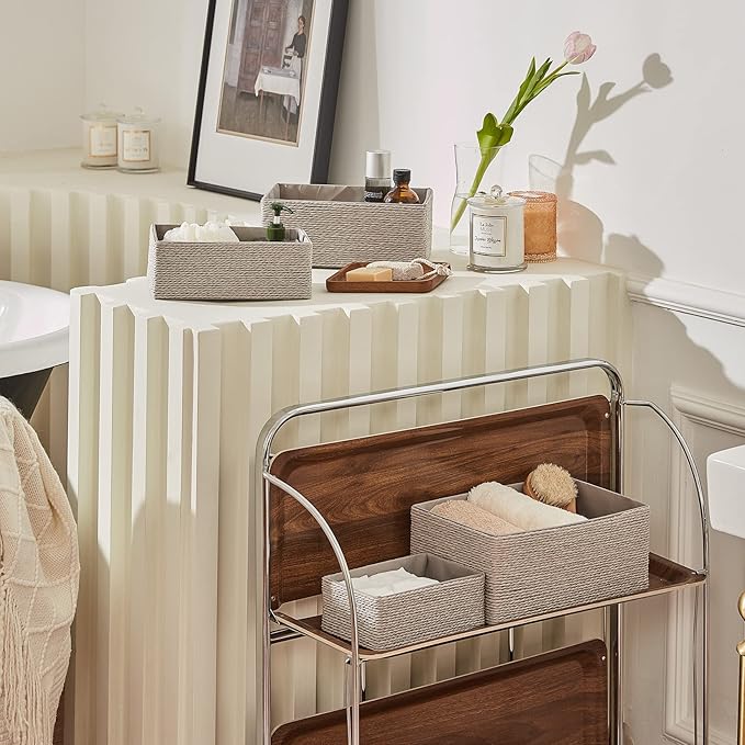 LA JOLIE MUSE Storage Baskets Set 4 - Stackable Woven Basket Paper Rope Bin, Storage Boxes for Makeup Closet Bathroom Bedroom (Gray)