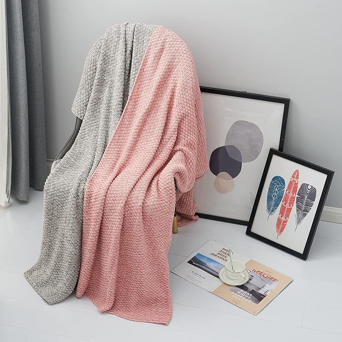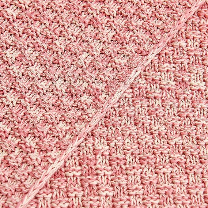 Longhui bedding Dusty Pink Knitted Throw Blanket for Couch, Soft, Cozy Machine Washable 100% Cotton Sofa Knit Blankets, Heavy 2.8lb Weight, 51 x 63 Inches, Pink and White Color, Laundry Bag Included