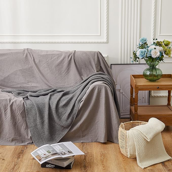 Longhui bedding Grey Knitted Throw Blanket for Couch, Soft, Cozy Machine Washable 100% Cotton Sofa Cable Knit Blankets, 4.0lb Weight, 60 x 80 Inches Oversized, Grey White Color