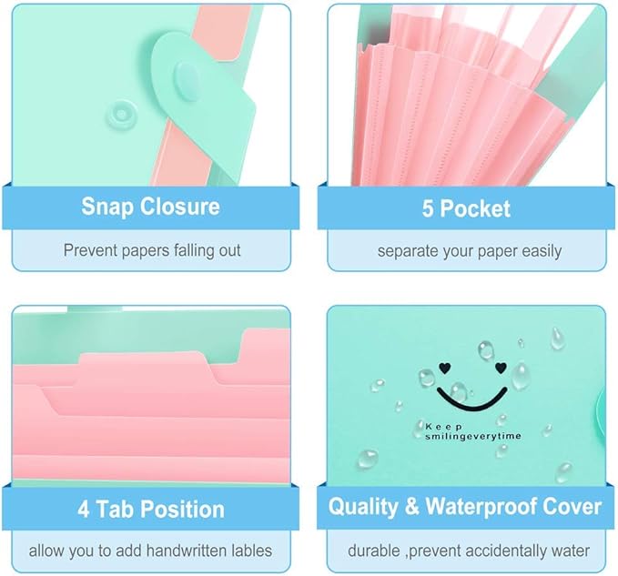SKYDUE Expanding File Folder with 32 Labels, 5 Pockets A4 Letter Size Accordion Folder Paper Organizer for School and Office Pack of 4