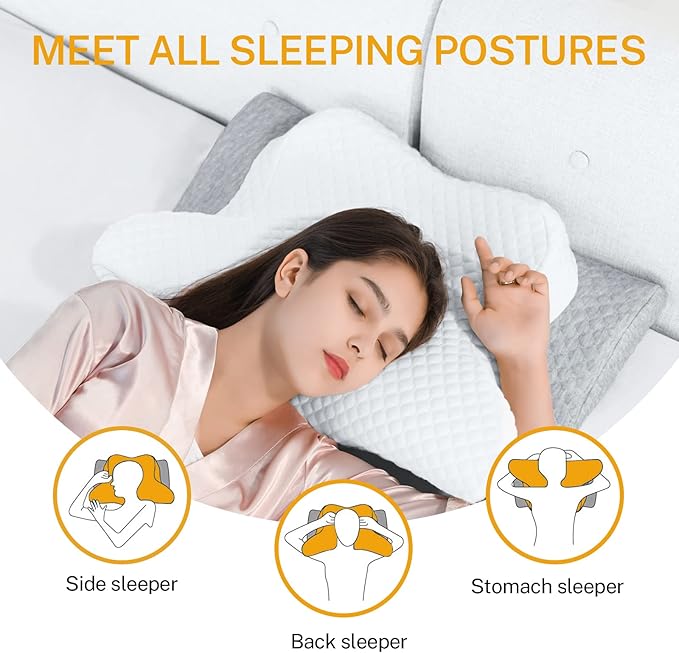 - 【Ideal Pillow for Back/Side Sleeping】Butterfly-shaped orthopedic pillows customized for back and side sleeping. When you sleep on your back, the natural traction of the neck and head support can reduce the pressure on the posterior skull, reduce snoring and improve sleep quality. When sleeping on the side, please sleep on the wing side, make sure the incision under the wing fits your shoulder curves, release the shoulder pressure, and place the arm on the armrests to reduce the numbness.