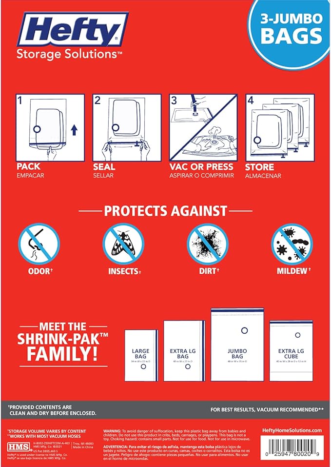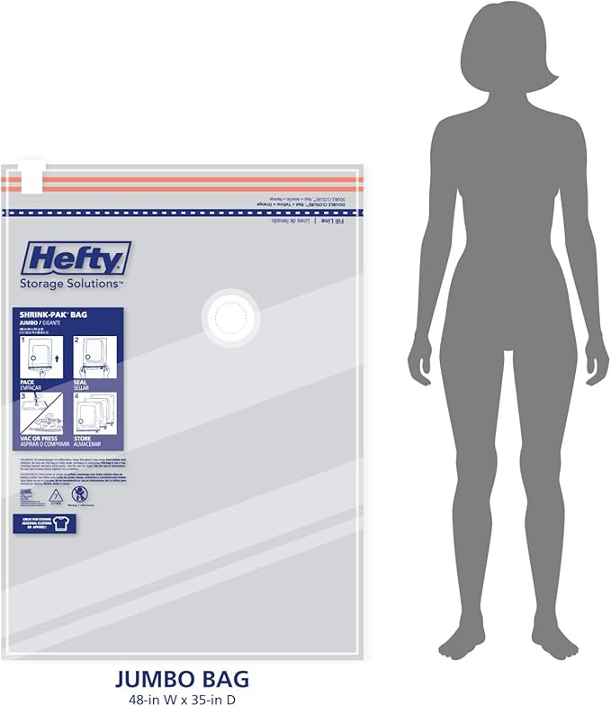 - VERSATILE: Hefty SHRINK-PAK vacuum storage bags are a versatile solution, whether you're storing items at home, packing for a trip, or moving to a new place. They can accommodate a wide range of items, from clothing and bedding to towels and more. This makes them a valuable addition to any home, providing a practical and effective way to manage your storage space.