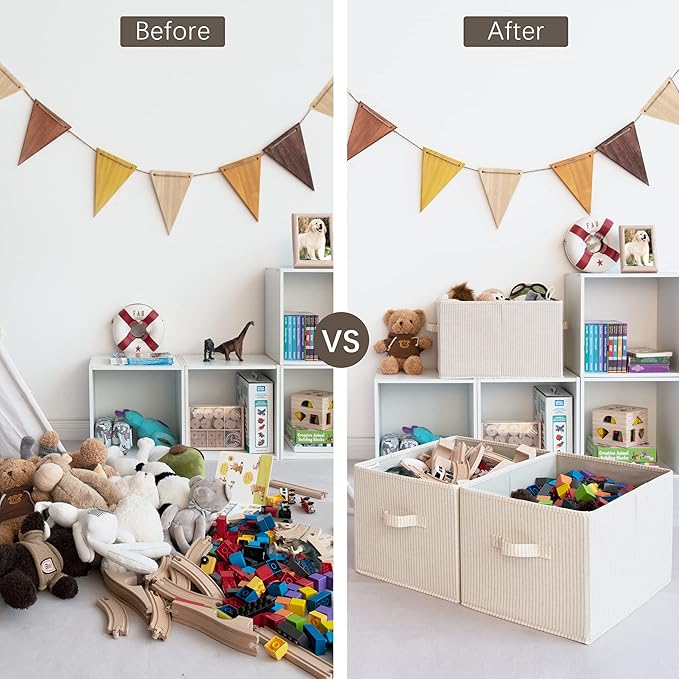 StorageWorks Storage Baskets for Shelves, Foldable Fabric Closet Storage Bins with Handles, Fabric Storage Bins Clothes Organizer, Beige Stripes, 3-Pack, Extra Large