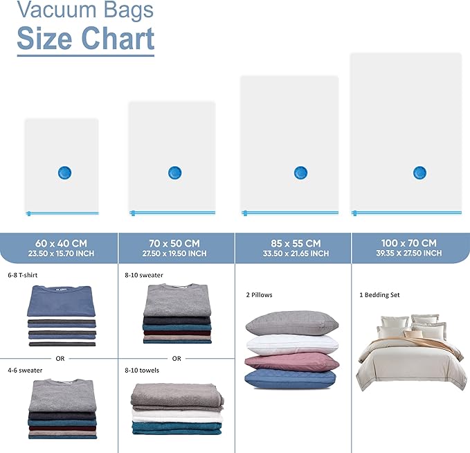 - Increase 80% storage space: our vacuum bags add more room to your clothes storage & wardrobe, lofts & suitcase by 4 times. Our vacuum sealer bags can be used for a variety of items including clothes, comforters, pillows, duvet, beddings, etc.