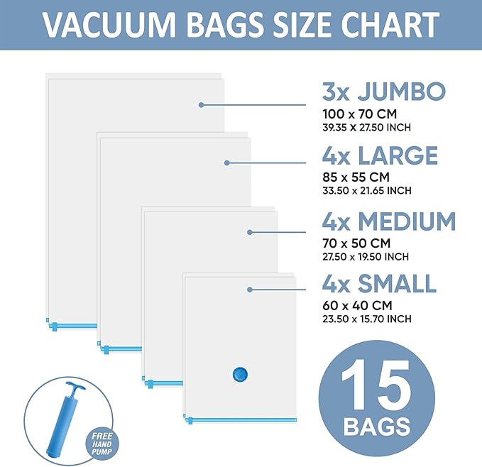 - 15 combo includes: 3 jumbo bags (39.4 x 27.5 in) fitting 1 bedding set; 4 large bags (33.5 x 21.7 in) fitting 2 pillows; 4 medium bags (27.5 x19.5 in) fitting 8-10 clothes/towels; 4 small bags (23.5 x 15.7in) fitting 6-8 T-shirts or 4-6 sweaters.