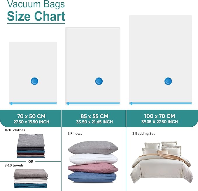 - Hand pump included: the space saver bags combo contains 1 hand pump that is easy to use to vacuum the air out. The vacuum seal bags are compatible with vacuum cleaners and can be used repeatedly.