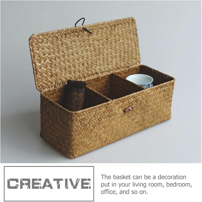 Cabilock Woven Storage Basket with Lid 3-Section Rectangular Seagrass Organizer for Living Room Pantry and Desktop Storage 12.6X4.7X4.3 Inch Handcrafted Bin