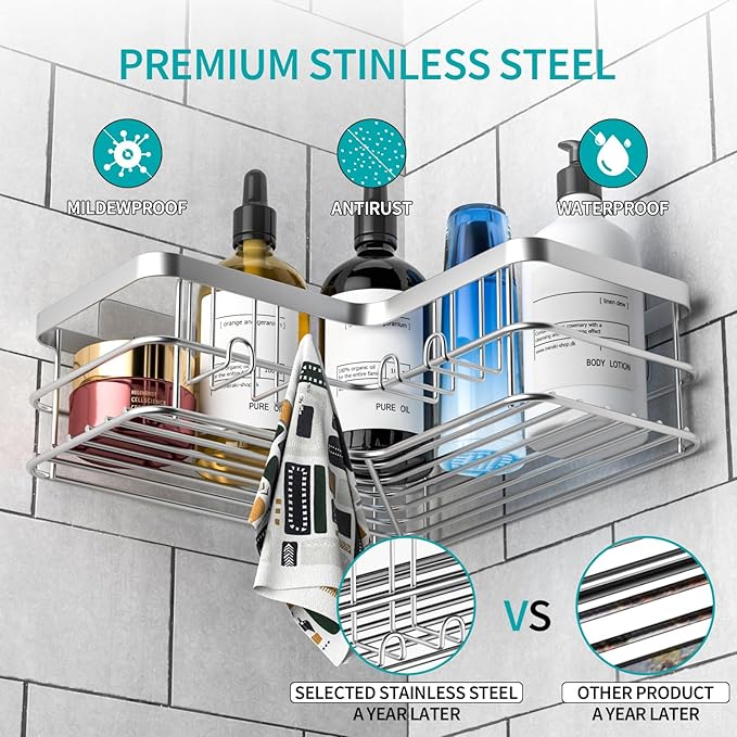 - 【Perfect Design】 adhesive shower shelves is made of stainless steel, no rust, no fading, scratch-resistant and durable. Besides, shower corner caddy adupted open grid design for maximum air ventilation and water dripping away, does not breed dirt and keeps your bathroom cleaner.