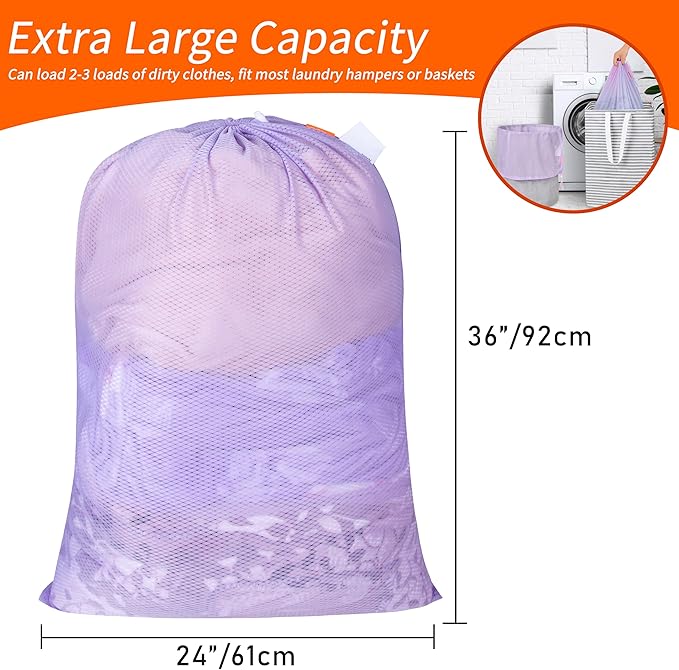 Polecasa Heavy Duty Large Mesh Laundry Bags with ID Tag and Locking Drawstring Closure - 2 Pack, 24 x 36 inches - Laundry Hamper Liner, Washable Laundry Bag for Travel, Sports, Dorms (Purple)