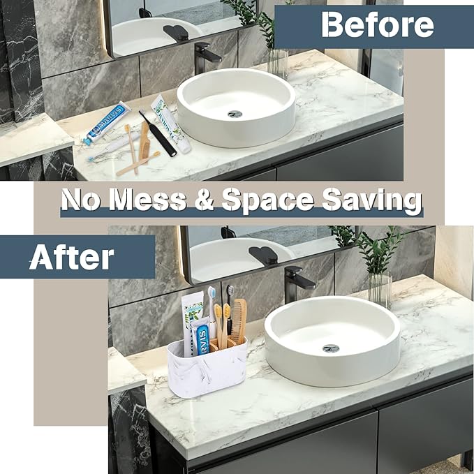 - Bathroom Organizer:This bathroom toothbrush and toothpaste organizer is made of durable PP material and marble powder to fit home marble countertop style, Size:6.88"L x 3.3"W x 3.93"H