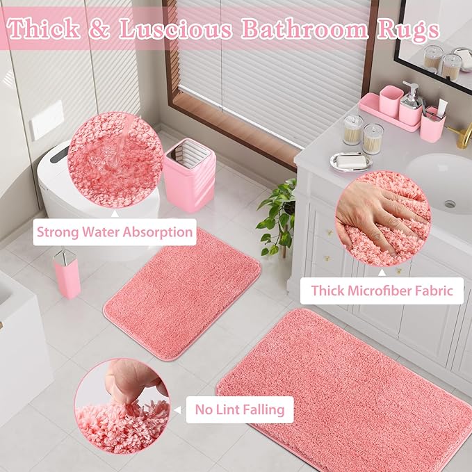 - 🛁【Super Absorbent & Quick Dry Bathroom Rugs】Pink bathroom rug is made from ultra-fine fibers which have dense pores, enabling it to absorb water faster and in larger quantity compared to regular bath mats, and instantly separates wet and dry, leaving no traces in your bathroom. The bottom of the mat is made with a new type of high-quality TPR material, which adheres seamlessly to the floor, making it slip-resistant and stable.