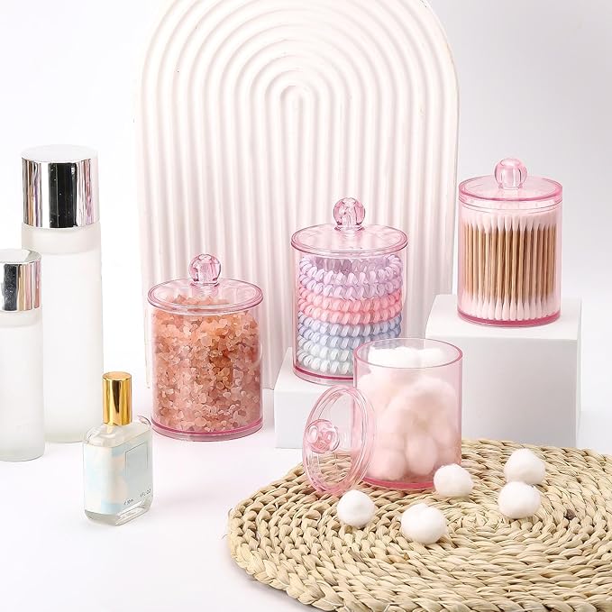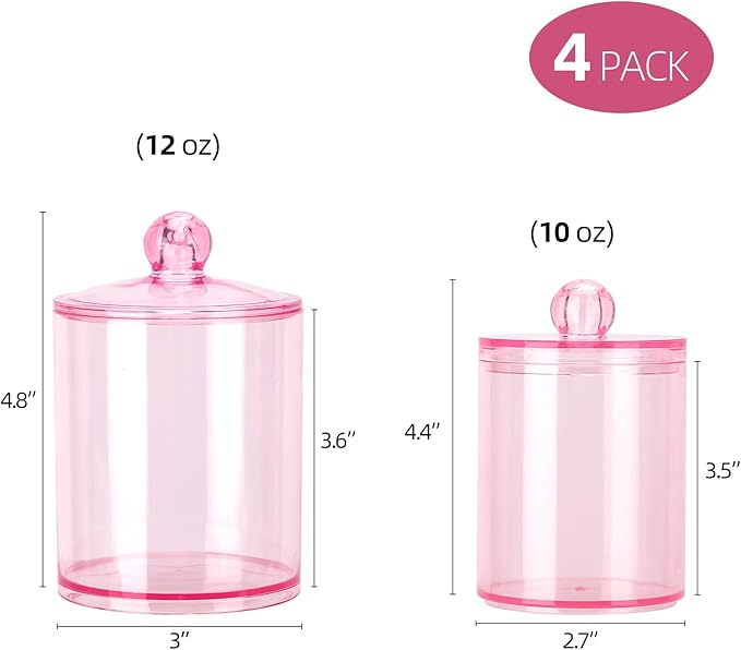 Tbestmax 12 oz & 10 oz Qtip Holder - 4 Pack Restroom Bathroom Organizers and Storage Containers, Pink Plastic Apothecary Jars with Lids for Cotton Swab, Cotton Round Pads, Floss