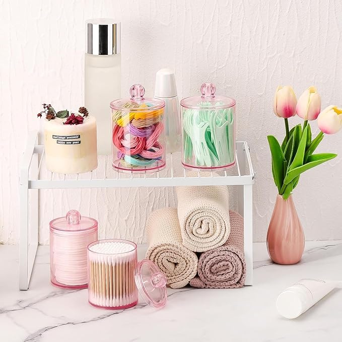 - Bathroom Containers - 2 pack 10-ounce, 2 pack 12-ounce bathroom organizer canisters are JUST RIGHT for Q-tip, cotton ball, cotton swab, cotton rounds, floss picks, tampon, bath salts, hair tie band, makeup brush, beauty egg, face brush, crayons, candy, pens, clip and more small things