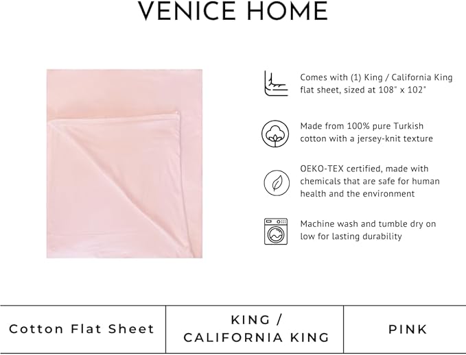 100% Cotton Flat Top Sheet Only - T-Shirt Fabric Jersey Knit - Extra Soft - Wrinkle Free - Machine Washable - Easy Fit - Breathable - Comfy (Pink, King/Cal. King)