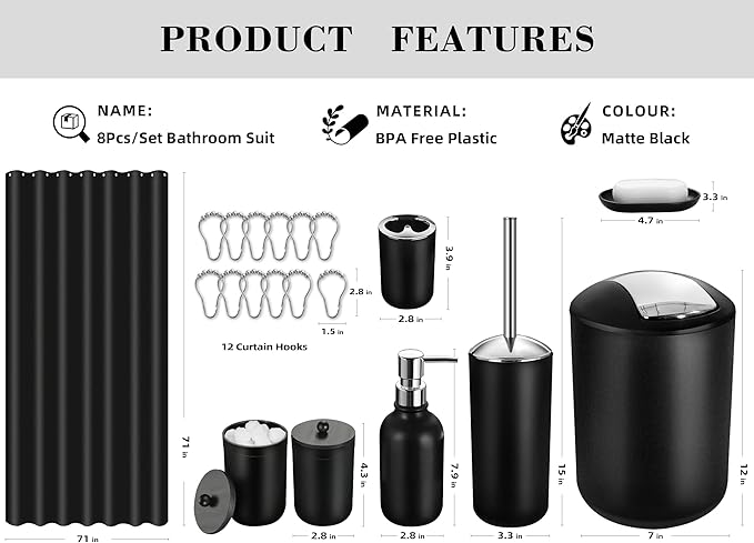 - đăComplete Black Bathroom Accessories Set (20 Pieces)ăUsing this black bathroom accessory set, you can organize almost everything in the bathroom. The bathroom accessory set includes 1 1*71"Lx71" W bathroom shower curtain sets with 12 hooks, 1 trash can, 1 soap dispenser, 1 soap dish, 1 toothbrush holder, 1 toilet brush and holder, and 2 qtip holder. This matte black bathroom accessories set complete keeps the bathroom organized while adding a minimalist textured style.