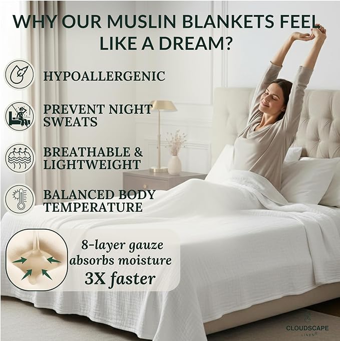 - LUXURIOUS 8-LAYER SOFTNESS – The ultimate muslin blanket for adult. Crafted from 100% Cotton, offering a gentle, cloud-like comfort. Generously oversized at 92" x 108" to fit up to California King beds perfectly.