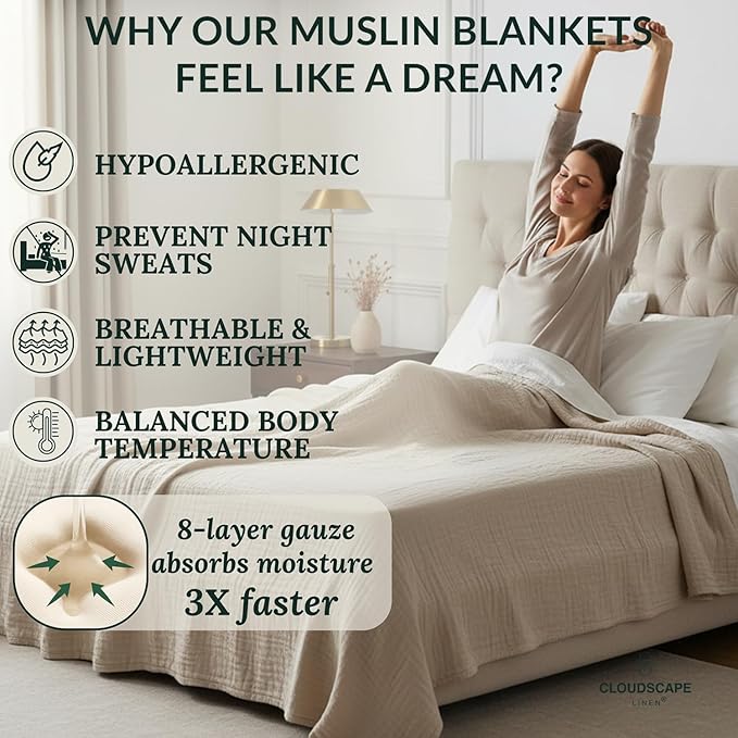 - 100% COTTON: LIGHTWEIGHT & BREATHABLE – Crafted from soft, natural 100% Cotton Gauze, this 8-Layer Muslin Blanket is ideal for sensitive skin. The soft and breathable weave promotes airflow, ensuring comfortable sleep without overheating.