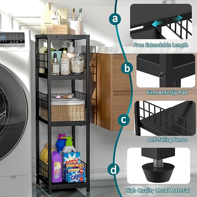 - ✅【Expandable Unique Design】Our 4 tier narrow shelf can extend its length freely, making it suitable for different usage scenarios. You can adjust the width of the storage rack according to your needs, in order to adapt to different storage spaces and maximize storage efficiency.