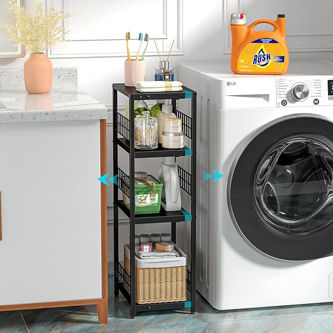 DAOUTIME Expandable Slim Storage Shelf, 4 Tier Metal Shelving Unit for Bathroom Storage Organizer, Freestanding Narrow Shelf for Small Spaces, Open Floor Shelves for Bathroom, Laundry Room, Kitchen