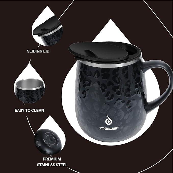 Ideus 16 oz (470 ml) Insulated Coffee Mug with Handle and Lid, Double Wall Stainless Steel Vacuum Thermal Coffee Mug, Travel Coffee Cup Thermal Cup for Home and Office, Leopard Black