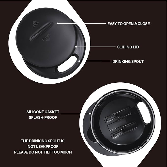 - 【PRESS-IN LID】- Silica gasket seals to achieve maximum spillproof capability. Drinking hole on the top, with a splash-proof sliding cover. Please note it is to keep drinks contained and prevent heat/cold from escaping. It is not leakproof.