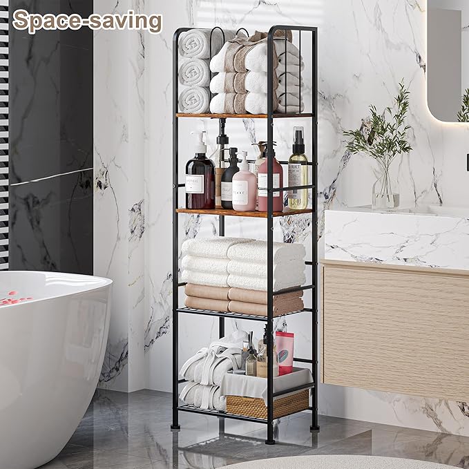 - 【Spacious 4-Tier Shelving】With 4 spacious shelves, this towel shelf offers plenty of room for all your bathroom essentials. The top two levels are perfect for storing towels, while the bottom shelf can hold various toiletries and skincare products. The towel racks for bathroom storage allow you to keep everything organized, making your bathroom orderly and easy to maintain.