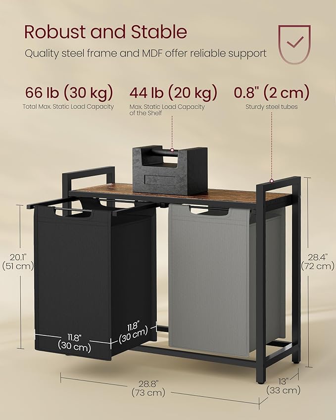 - Sturdy and Stable: With a 0.8" thick steel frame and MDF panel, the shelf of this laundry basket supports up to 44 lb. The Oxford fabric bags are water-resistant, and the 4 adjustable feet provide excellent stability