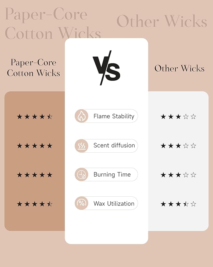 - Clean Consistent & Even Burn - Using 2 American made lead-free cotton wicks for a even burn result. They're cotton flat braid wicks with paper throughout, providing increased rigidity and burn more consistently than 100% cotton wicks. Designed to reduce carbon buildup which leads to black soot