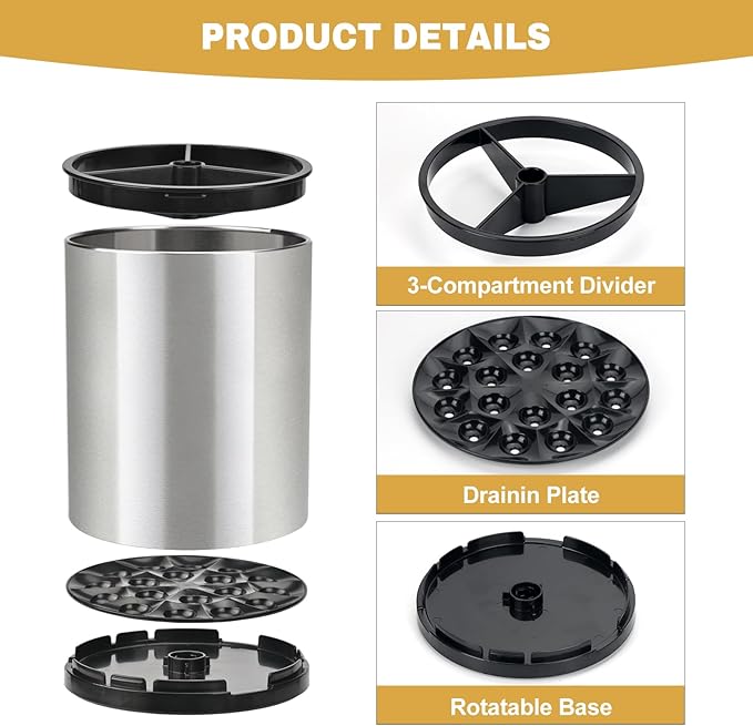 - 【3 COMPARTMENT DESIGN】- Dishwasher safe. All plastic parts: 3-compartment divider, rotating base and draining plate are removable. Please wash the utensil crock thoroughly before first use!