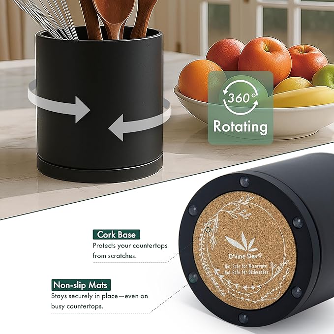 - 360° Rotating Base: The D'vine Dev utensil holder features a smooth 360° spinning base that allows you to effortlessly reach all your kitchen tools with a simple turn — no more digging around in a cluttered drawer!