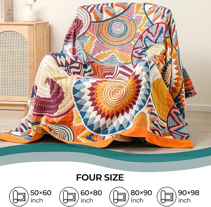King Throw Blanket for Bed 100% Cotton Boho Oversized Soft Cozy Muslin Quilt Blanket Double Embroider Sun, Vintage Farmhouse Cottage Woven All Season Blankets for Bedding Couch,90"×98"