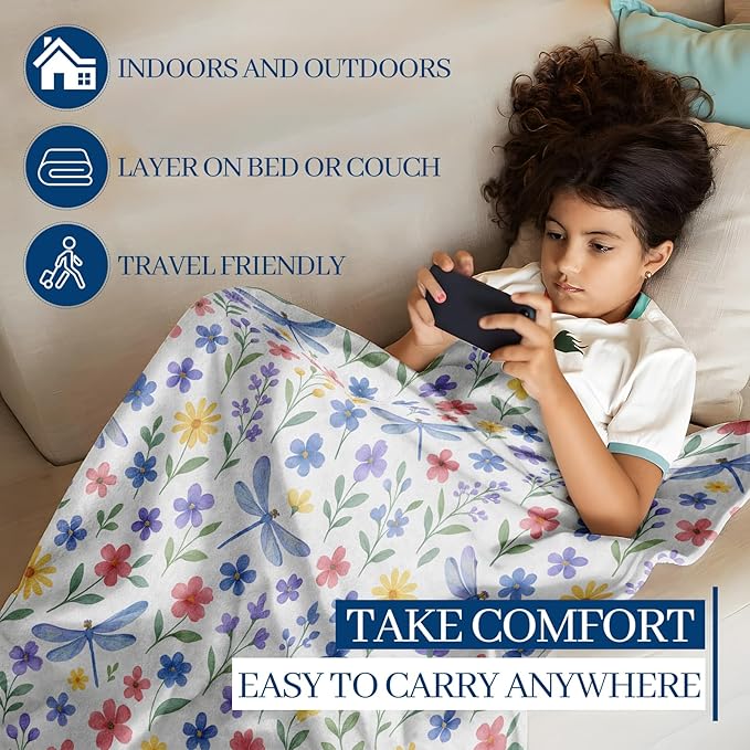 Dragonfly Floral Blanket, 50"x40" Flannel Cozy Lightweight Colorful Wildflower Throw Blankets Gifts for Couch Bed Living Room Decor, Soft Blanket for Women Kids
