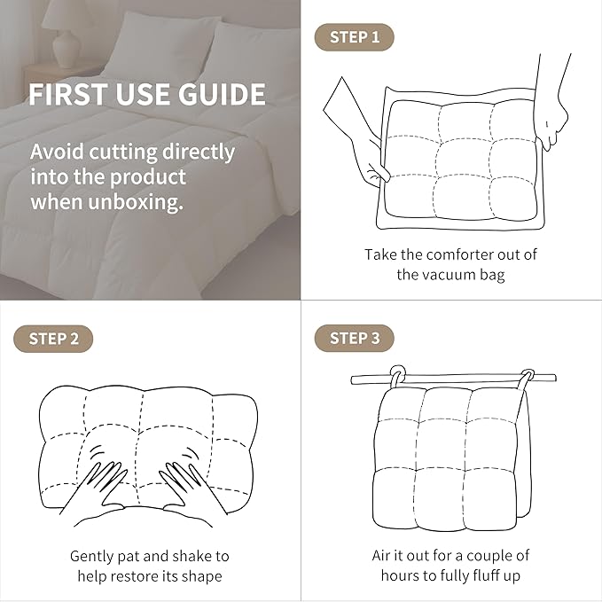 - Use Tips: Our white feather down comforter is vacuum packed, after receiving the product, it is recommended to shake it out and let it air for a few days to restore its fluffiness and ensure the best user experience. The SAPHREAS duvet insert comes with a 3-year warranty. Each bedding comforter also includes lifetime assurance and a 100% Satisfaction Guarantee. For any questions or concerns, please email our customer service team, and we will promptly assist you.